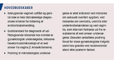 Der er flere gode grunde til at lave gynækologisk undersøgelse inklusive wet smear-undersøgelse hos kvinder med udflådsgener, og det øger sandsynligheden for korrekt diagnose signifikant [25-27]. Wet smear-undersøgelse anses for at være god klinisk praksis ved mistanke om vaginale infektioner [15, 23, 28]. Hvis man påbegynder empirisk behandling på baggrund af en forkert diagnose, risikerer man at forværre kvindens vaginale gener, at ødelægge mikrobiomet og at medvirke til uhensigtsmæssig antibiotikabehandling og resistensudvikling [16, 28].