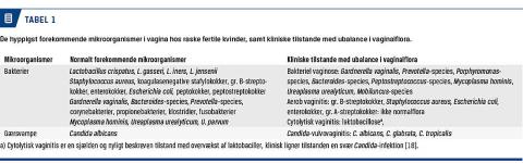 Der kan identificeres mere end 200 forskellige bakterier hos normale kvinder i den reproduktive alder [12]. De fem hyppigste normalt forekommende grupper af mikroorganismer er anført i Tabel 1 [13]. Her er desuden anført tilstande, hvor normalfloraen er ændret. Mælkesyrebakterier (laktobaciller) er de dominerende bakterier og skaber en stabil pH på ca. 4,5, hvilket hæmmer væksten af andre bakterier [2, 14]. De fleste kvinder er koloniseret med 1-2 forskellige laktobacillusarter [13].