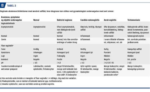 Der er lavet flere undersøgelser af, hvor gode læger og patienter er til at identificere gynækologiske infektioner/ubalancer korrekt ud fra symptomer [25, 29, 30]. I et studie af Ferris et al undersøgte man, hvor gode kvinder var til at selvdiagnosticere Candida-infektion, når de havde kendskab til symptomerne [30]. Af dem, som aldrig tidligere havde haft en infektion, kunne kun 11% foretage korrekt selvdiagnose, ved recidiverende Candida-vulvovaginitis (CVV) gjaldt det for 34%. Vulvovaginal kløe kan skyldes flere ting: CVV, BV, allergi, dermatologiske lidelser m.m. [18]. Vulvovaginal kløe er et af kardinalsymptomerne ved CVV, men omkring halvdelen af kvinder med BV har lignende symptomer. Hvis lægen kun forholder sig til dette symptom, vil kun 30-40% af patienterne have en Candida-infektion [14, 29]. Hvis man supplerer med gynækologisk undersøgelse, hvor man ser tegn på CVV (Tabel 2), stiger sandsynligheden for korrekt diagnose til 60-70% og til ca. 90%, hvis man tilføjer wet smear-undersøgelse [26]. For BV gør det samme sig gældende. Sandsynligheden for korrekt diagnose stiger til over 90% ved brug af kliniske kardinalsymptomer og wet smear (jf. Amselkriteri-erne) [25, 28].