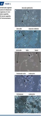 undersøgelse ses mange polymorfkernede leukocytter, parabasale celler (umodne pladeepitelceller med store kerner og sparsomt cytoplasma) og ingen/få laktobaciller samt mange kokkoide eller koliforme bakterier [22] (Figur 1D). Ved usikker diagnostik bør der tages podning til bakteriologisk undersøgelse.