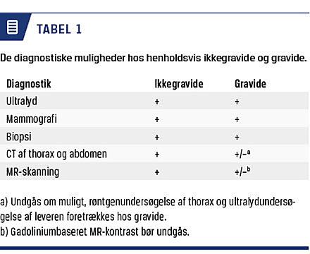 Mistanke om metastaser og undersøgelse heraf kræver CT af thorax og abdomen, alternativt røntgenoptagelse af thorax og UL-skanning af leveren, hvilket er at fortrække hos gravide. Finnålsaspiration er usikker hos gravide. Grovnålsbiopsi er den fortrukne metode til udredning af tumorer, som ikke opfylder kriterierne for simple cyster – også hos gravide [6]. Under en graviditet og amning ses dog atypisk cytologi i brystvævet, og det er derfor vigtigt, at den undersøgende patolog er informeret om, at biopsien er taget fra brystet hos en gravid eller ammende [2, 6]. Endelig vil bioptering i brystet hos en gravid eller ammende medføre risiko for infektion og dannelse af mælkefistler [2]. Sidstnævnte er dog et sjældent fænomen [6]. Tabel 1 viser de diagnostiske muligheder hos henholdsvis gravide og ikkegravide.