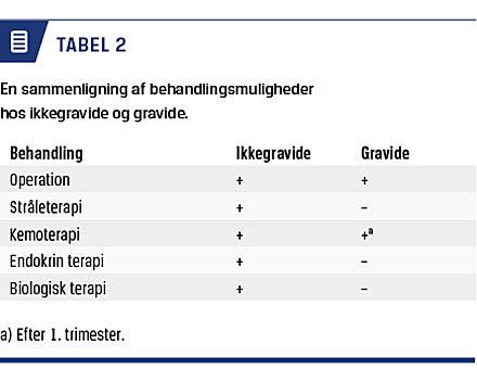 selvfølgelig af tumoren og udbredelsen, men også af gestationsalder. Behandling af brystkræft under en graviditet nedsætter behovet for tidlig igangsættelse af fødslen og derved fødsel af præmature børn [6]. I Tabel 2 ses en sammenligning af behandlingsmuligheder hos gravide og ikkegravide.