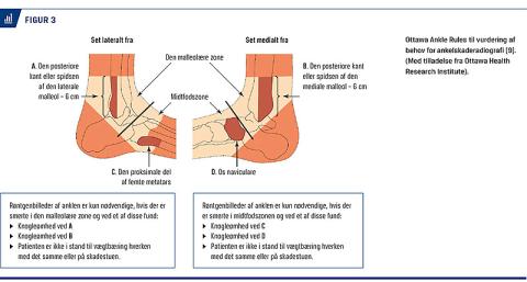 Diagnosen ALA stilles ofte ved en kombination af anamnese og kliniske undersøgelser. Patienter med ALA vil typisk have haft et vridtraume med akut smerte, hævelse og belastningsbesvær [8]. For at vurdere om et røntgenbillede af anklen er nødvendigt og udelukke større frakturer i ankelleddet, kan Ottawa Ankle Rules anvendes (Figur 3) [9]. Ottawa Ankle Rules er en valideret test til undersøgelse af patienter med et ankeltraume i den første uge efter skadestidspunktet [10]. Omkring 15% af patienterne, der har ALA og undersøges med røntgenoptagelse, har en ankelfraktur [10]. Ottawa Ankle Rules har en høj sensitivitet (97%) og en meget lav specificitet (35%). Dette giver en lille diagnostisk evne ved en positiv test (positiv likelihood-ratio 1,49) og en stor diagnostisk evne ved en negativ test (negativ likelihood-ratio 0,08) [10], hvilket betyder, at sandsynligheden for en fraktur efter en negativ Ottawa Ankle Rules-test er 1%. Ved en positiv test bør patienten sendes til røntgenundersøgelse.