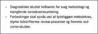 Evidensgrundlaget for diagnostik bør forbedres. Det er konklusionen af en årrækkes internationale, kritiske analyser af diagnostiske studier. Kritikkens hovedpunkter er: