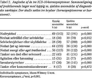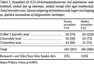 De læger, som inden for det seneste år havde modtaget psykiatrisk efteruddannelse eller som hyppigt anvendte diagnostiske redskaber, kendte i signifikant højere grad de depressive kernesymptomer i henhold til ICD-10: nedtrykthed, nedsat lyst og interesse og nedsat energi eller øget trætbarhed end de læger, som ikke havde modtaget efteruddannelse, eller som sjældent anvendte diagnoseredskaber (Tabel 1 og Tabel 2 ). Læger, der sjældent anvendte diagnostiske redskaber, mente i højere grad, at selvbebrejdelser eller skyldfølelse, tanker om død og selvmord og søvnforstyrrelser var depressive kernesymptomer. Af de 591 læger (78%), der besvarede dette spørgsmål, havde kun 24,2% alle tre kernesymptomer rigtige. Samme tendens viste sig for Prime-MD.