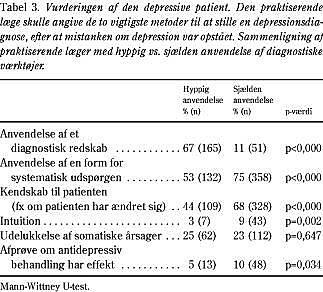 De tre hyppigste årsager til at få mistanke om depression hos patienter i almen praksis var, at patienten tidligere havde haft depression og igen præsenterede det samme sygdomsbillede, at patienten igen og igen sad i konsultationen uden klare årsager, eller at patienten fremtrådte ændret (Tabel 3). Læger, der sjældent anvendte diagnostiske redskaber, mente, at følgende metoder var de vigtigste for at kunne stille en depressionsdiagnose: anvendelse af en form for systematisk udspørgen, kendskab til patienten, intuition og afprøvning af om antidepressiv behandling havde effekt .