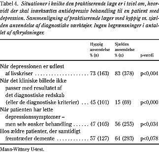 Størstedelen af begge lægegrupper (ca. 70%) anvendte en eller anden form for samtaleterapi som en del af den samlede antidepressive behandling. Begge grupper mente, at de vigtigste behandlingsmål (>86%) var, at patienten subjektivt oplevede, at behandlingen hjalp, og at den sociale funktionsevne blev genvundet. Begge grupper var desuden i tvivl om, hvornår en patient med depressionssymptomer er medikamentelt behandlingskrævende (95,3%). Gruppen af læger, der sjældent anvendte diagnostiske redskaber, var dog signifikant hyppigere i tvivl, når depressionen var udløst af livskriser, eller når patienten kun havde lette depressionssymptomer, men selv ønskede behandling, end lægegruppen med hyppig anvendelse af diagnostiske redskaber (Tabel 4 ). Sidstnævnte lægegruppe var kun hyppigere i tvivl end lægegruppen med sjælden anvendelse af diagnostiske redskaber, hvis der var uoverensstemmelse mellem den kliniske vurdering og resultatet af den diagnostiske rating.