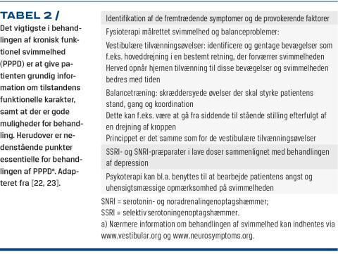 Behandlingen starter i overleveringen af diagnosen og en forsikring om den potentielle reversibilitet af symptomerne [6, 16, 21]. Information om diagnosen skal indeholde en forklaring af de underliggende mekanismer, da det er væsentligt, at patienten forstår, at det drejer sig om et maladaptivt respons frem for en strukturel skade. Når patienten er klar over, at det er et »software«-problem og ikke et »hardware«-problem, fremstår behandlingsformen, hvor man fokuserer på retrain the brain, fornuftig, og der vil sandsynligvis være en større forståelse for til tider lang varighed af behandlingen. Behandlingen bør tilpasses den individuelle patient, så evt. komorbiditet såsom angst, BPPV, neuritis vestibularis og andre komplicerende faktorer også adresseres efter behov [5]. Det samme gælder eventuelle sekundære symptomer såsom ændret gangfunktion og nakkesmerter samt evt. vedligeholdende faktorer.