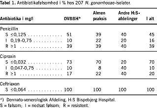 Resistensbestemmelse over for penicillin, ciprofloxacin og ceftriaxon blev foretaget som MIC med E-test (AB Biodisk, Solna, Sverige). Følsomheden blev vurderet med samme breakpoints som på Statens Serum Institut (SSI) (Tabel 1 ).