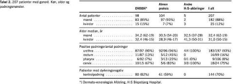 Demografi ske data, podningsmønster og andel af hhv. positive podninger og negative kontrolpodninger er vist i Tabel 2 . Optimal podning, dvs fra både urethra, pharynx, rectum og evt. cervix (Sundhedsstyrelsens retningslinjer [7]), blev primært udført hos patienterne fra DVBBH, 88 patienter (90%), versus seks patienter (6%) fra almen praksis (p > 0,0001). I alt blev 95% af patienterne podet fra urethra, hvoraf 93% fik isoleret GK. 8% var gonorépositive fra mere end en podningslokalisation.