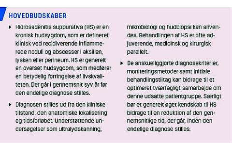 Hidrosadenitis suppurativa (HS) er en kronisk hudsygdom, som er defineret klinisk ved recidiverende inflammerede noduli og abscesser i aksillen, lysken eller perineum [1]. Det patogenetiske omdrejningspunkt er hårfolliklerne i de intertriginøse områder. Sygdommens navn er historisk betinget, da det fejlagtigt indikerer affektion af svedkirtlerne. Internationalt har man dog holdt fast i navnet for at sikre kontinuitet. Selvom ætiologien endnu er uvis, er der igennem de seneste år opnået betydelige fremskridt inden for flere af sygdommens aspekter (f.eks. behandling) [2].