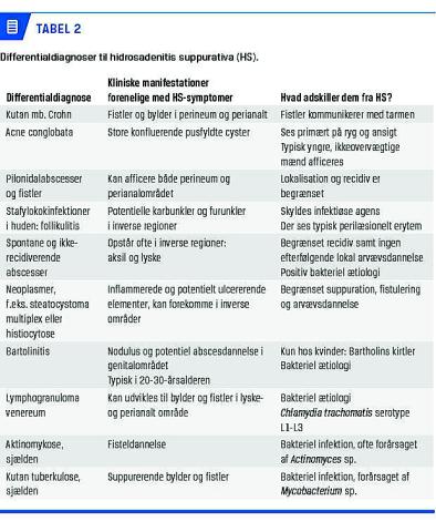 Der er påvist en association imellem Crohns sygdom og HS i epidemiologiske studier [14, 15]. Kutan Crohns sygdom kan desuden have en symptomatologi magen til HS’s med inflammerede bylder og/eller fistler i perineum og perianalt. Ydermere er der flere lighedspunkter i patogenese og behandlingsstrategi for de to sygdomme [16]. Crohns sygdom er derfor en betydelig differentialdiagnostisk udfordring ved objektiv undersøgelse.