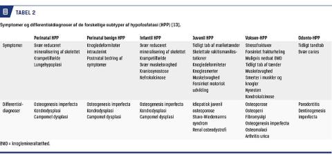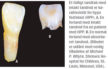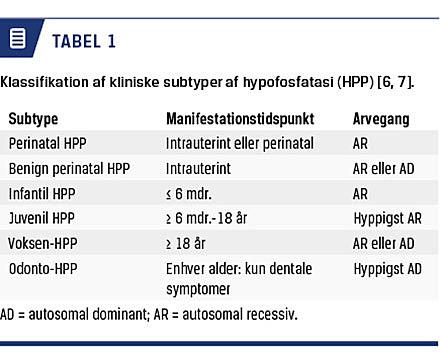 Hypofosfatasi (HPP) er en sjælden, arvelig knoglemetabolisk sygdom, som forårsages af mutationer i genet ALPL. Mutationerne medfører nedsat aktivitet af enzymet alkalisk fosfatase (ALP), som varetager en vigtig rolle i mineraliseringen af knogler og tænder [1]. Sygdommen karakteriseres af et bredt spektrum af skeletale og dentale symptomer samt en stor variabilitet i sværhedsgraden [2]. Der forekommer såvel svære perinatale og infantile former af HPP som milde former, der ofte først diagnosticeres senere i barndommen eller i voksenlivet [3]. I løbet af de seneste år er der fremkommet ny viden om HPP i relation til diagnosticering og behandling. Denne artikel har til formål at fremme kendskabet til HPP og give et overblik over diagnosticerings- og behandlingsmulighederne.