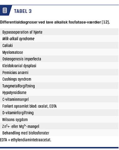Vedvarende lav ALP-værdi er nøglen til at opdage sygdommen [7]. Det er dog afgørende, at der anvendes køns- og aldersspecifikke referenceintervaller, idet ALP-niveauer er væsentligt højere i vækstperioden og falder i puberteten, hvilket sker tidligere hos piger end hos drenge [11]. Fra nogle kliniske laboratorier rapporteres der kun et serum-ALP-referenceinterval for voksne, hvorfor infantile/juvenile former af HPP kan forblive udiagnosticerede. Andre årsager til nedsatte ALP-værdier bør endvidere udelukkes (Tabel 3) [12]. Kalcium- og fosfatniveauerne i blodet kan være normale eller lidt forhøjede. Derudover bidrager måling af ALP’s substrater til at kunne verificere sygdommen