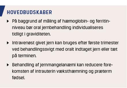 Jernmangel og jernmangelanæmi i graviditeten indebærer en alvorlig risiko for både kvinden og fosteret. Der anbefales screening af alle gravide i første trimester for hæmoglobin- og ferritinmangel. Screening for jernmangelanæmi kan med fordel foretages hos egen læge i forbindelse med rutinemæssig svangreundersøgelse, alternativt i forbindelse med et eventuelt forløb på en obstetrisk afdeling. Oralt indtaget jern i individualiseret dosis er førstevalg, mens intravenøs jernbehandling kan overvejes ved behandlingssvigt eller til hurtig korrektion sent i tredje trimester. Svær jernmangelanæmi kan være skadelig for fosteret, og den gravide kvinde bør tilbydes tilvækstskanning i andet trimester. Behandling af jernmangelanæmi giver signifikant bedre neonatalt udkomme. Anbefalingerne for screening, behandling og kontrol skal ses i lyset af de lave omkostninger, der er forbundet hermed, bedre komplians og ingen alvorlige bivirkninger ved optimeret