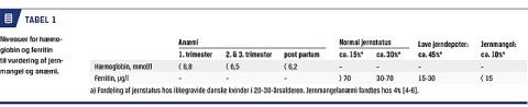 Under en graviditet øges jernbehovet, idet jern bruges til udvikling af foster og placenta samt produktion af erytrocytter. Da antallet af erytrocytter øges med 20% og plasmavolumen med 50%, falder hæmoglobinniveauet hos gravide fysiologisk. Hæmoglobinniveau er ikke en sufficient prædiktor for jerndepoter, idet hæmoglobinniveauet først falder ved ferritinniveau < 15 µg/l. Derudover har nogle kvinder fysiologisk lavt hæmoglobinniveau, samtidig med at de har normale jerndepoter [2]. Fald i ferritinniveau vil være første tegn på begyndende jernmangel, og måling af hæmoglobinniveau bør derfor suppleres med måling af ferritinniveau. Ferritinniveauet kan dog blive forhøjet ved inflammatoriske tilstande [3], hvilket kan være en fejlkilde. Flere andre metoder til vurdering af jerndepoterne kan bruges, men afvejet i forhold til pris og laboratorietilgængelighed er ferritinniveau at foretrække [4]. Referenceintervaller for hæmoglobin- og ferritinniveau fremgår af Tabel 1.
