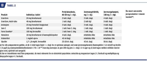 Kvinder med hæmoglobinniveau < 6,5 mmol/l og lavt ferritinniveau i andet og tredje trimester behandles med oralt indtaget jern [26]. Behandlingsforslag fremgår af Tabel 2. Behandlingseffekten bør kontrolleres med måling af hæmoglobinniveau efter to uger. I et review, der er baseret på tre randomiserede studier med i alt 266 kvinder, fandt man signifikante forskelle til fordel for oral jernbehandling frem for placebo og ikkesignifikant øgning af bivirkninger, såsom kvalme, opkastning, obstipation og abdominalsmerter [27].