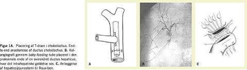 Hvis der er substanstab eller stramning af de to choledochus-ender, skal man ikke foretage rekonstruktion over T-dræn, idet der kommer nekrose af anastomosen, lækage og stenose. Det bliver herefter meget vanskeligt senere at foretage rekonstruktion. I disse tilfælde anlægges en hepatikojejunostomi ad modum Roux (Figur 1C ). Da choledochus på dette tidspunkt er af normal størrelse, er det ofte teknisk vanskeligt at a nlægge anastomosen, og der kan komme stenose af anastomosen med efterfølgende kolangit.