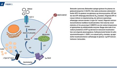 Hos raske personer med normal glukosetolerans (NGT) stiger den intracellulære koncentration af adenosintrifosfat (ATP) ved stigende plasmaglukoseniveau pga. øget glukoseoptagelse og glukosemetabolisme. ATP binder og lukker ATP-afhængige kaliumkanaler (KATP-kanal) og udløser derved depolarisering af cellemembranen. Depolariseringen aktiverer spændingsafhængige calciumkanaler, hvilket udløser eksocytose af insulin fra betacellerne [11]. Patienter med MODY3 har en lavere insulinudskillelse ved stigende plasma-glukose end raske personer [12]. Årsagen til den nedsatte glukoseomsætning er primært nedsat ekspression af glykolytiske og mitokondrielle enzymer. Konsekvensen er en reduceret produktion af ATP, hvilket resulterer i en nedsat insulinsekretion og efterfølgende hyper-glykæmi [11, 13]. SU binder til SU-receptor-1, s om er en subunit på KATP-kanalerne, og lukker derved KATP-