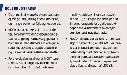 I Danmark er 300-400 personer diagnosticeret med MODY3, men 3.000-6.000 estimeres at have sygdommen uden at vide det [5]. Diagnostik af MODY3 er udfordrende og vigtig fordi: 1) Diagnosen giver mulighed for genetisk rådgivning [6], 2) behandlingen afviger fra behandlingen af øvrige diabetesformer [6], og 3) risikoen for både mikro- og makrovaskulære diabetiske komplikationer er på niveau med risikoen ved type 1-diabetes (T1D) og type 2-diabetes (T2D) [7]. Mange patienter med MODY3 bliver ofte fejlagtigt behandlet med insulin på grund af misklassifikation af deres diabetestype. Selv efter længerevarende insulinbehandling kan patienter med MODY3 ofte opnå signifikant forbedret glykæmisk kontrol og mindre udsving af plasmaglukoseniveau ved at skifte fra insulin til sulfonyl-urinstof (SU) [8]. Ligesom i anden diabetesbehandling er god glykæmisk kontrol og reduktion af øvrige kardiovaskulære risikofaktorer essentiel for en god prognose. I denne artikel beskrives kliniske karakteristika, diagnostik og behandling af patienter med MODY3.