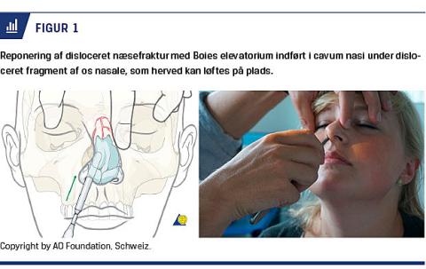 Lukket reponering foregår typisk i lokalanæstesi, hvis patienten kan kooperere til dette [6]. Der placeres lidocain-adrenalin vædede mecher under ossa nasalia i 15-20 minutter, og herefter anlægges der lokalbedøvelse (f.eks. lidocain-adrenalin) i slimhinden under os nasale og subkutant over ossa nasalia. Med et elevatorium indført under os nasale i næsehulen og med støtte fra kirurgens fingre på næseryggen manipuleres knoglefragmenter tilbage til korrekt stilling (Figur 1). Efter reponering undersøges næsen for tilfredsstillende resultat, hvorefter næsehulen pakkes med steroidantibiotikavædede mecher for at holde knogler og septum på plads. Næsen beskyttes med en ydre skinne i en uge [6, 7].