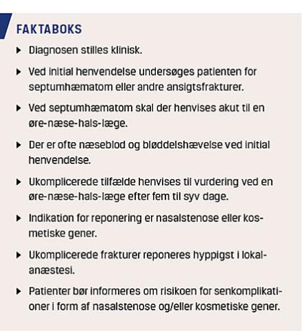 Næsen er pga. sin fremskudte position i ansigtet sårbar for traumer. Således er fraktur af næsen den hyppigste ansigtsfraktur og den tredjehyppigste af alle frakturer [2]. Skadestuelæger ser ofte patienter med traumer mod næsen, og denne artikel har til formål at vejlede i initial diagnostik samt give indblik i akut og sen behandling.