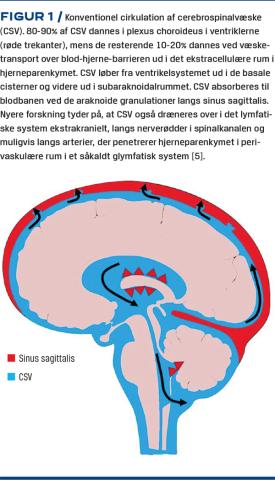 Normal cirkulation af cerebrospinalvæske (CSV) er vist i Figur 1. Ved iNPH er der ubalance mellem CSV-produktion og resorption, men de præcise patofysiologiske mekanismer er uafklarede. Nyere studier tyder på, at clearance af CSV via det glymfatiske system er kompromitteret. Det fører til ophobning af CSV i det interstitielle væv og nedsat eftergivelighed (komplians) af hjernevævet. Ved iNPH er pulsationsamplituden i CSV og ICP øget, hvilket er foreneligt med den nedsatte komplians[2, 6]. Shuntbehandling kan normalisere ICP-pulsationsamplituden, hvilket indikerer, at hjernevævets komplians og den glymfatiske clearance af CSV stiger efter shunt [6]. iNPH skyldes dog ikke udelukkende abnorme biohydrauliske forhold i CSV, da anden patologi ofte også indgår i tilstanden.