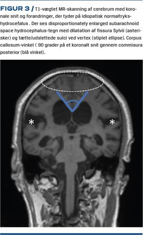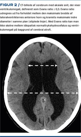 For at man kan stille diagnosen iNPH, skal der være påvist ventrikulomegali med forhøjet Evans ratio (Figur 2). Ventriklerne bliver større med alderen, og ca. 20% af personerne over 70 år har billeddiagnostisk ventrikulomegali[20]. MR-skanning foretrækkes frem for CT ved udredning af iNPH, da karakteristika udover ventrikulomegali kan visualiseres med MR-skanning.