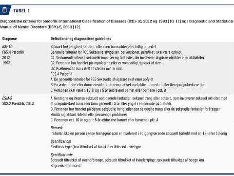 Pædofili er en psykiatrisk diagnose, der figurerer i ICD-10 [10, 11] og DSM-5 [12] (som er identisk med DSM-IV-TR). I Tabel 1 opsummeres kriterierne for ICD- og DSM-diagnoserne. Der er stort overlap mellem de diagnostiske kriterier, men variation i specificitet af dem. I den kortfattede udgave af ICD-10 [10], der ofte anvendes i dansk klinisk praksis, defineres pædofili kortfattet som seksuel forkærlighed for børn i sen barnealder eller tidlig pubertet. I ICD-10 til forskningsbrug [11] defineres pædofili som vedvarende/dominerende præference af seksuel aktivitet med et eller flere præpubertære børn. I DSM-5 [12] defineres pædofili som gentagne og intense seksuelt ophidsende fantasier, trang eller adfærd, som involverer et præpubertært barn eller børn (generelt ≤ 13 år). Der defineres således lidt lavere aldersgrænse for barnet lavere i ICD-10 [11]. Præferencen skal i ICD-10 [11] og DSM-5 have været til stede i min. seks måneder, og personen, som har handlet på eller været væsentligt generet af præferencen, skal være mindst 16 år og mindst fem år ældre end barnet. I DSM-5 skelnes der mellem pædofil seksuel interesse og pædofil seksuel forstyrrelse; sidstnævnte forudsætter, at driften afstedkommer en adfærd, som er skadelig for personen selv eller andre. I DSM-5 skal præfereret køn (dreng, pige, begge køn) og eksklusivitet (er personens drift udelukkende rettet mod børn) specificeres, samt hvorvidt der er tale om incest.