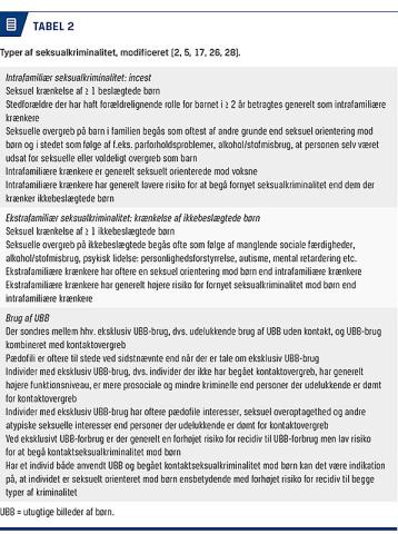 Seksualkriminelles recidivrisiko korrelerer positivt med observationstiden. I 20-30-års followupundersøgelser rapporteres ca. 30% af dem, der dømmes for seksualkriminalitet mod børn at blive dømt for fornyet seksualkriminalitet [17], også danske dømte [26]. I en tysk followupundersøgelse recidiverede 50-80% af dem med hel/delvis præference for børn til fornyet seksualkriminalitet i løbet af 25 års followup mod 10-30% af dem, der ikke var diagnosticeret med pædofili [27]. De dømte grupperes vanligvis i forhold til beslægtethed med offer (ekstrafamiliære og intrafamiliære/incest dømte) og kriminalitetstype (kontaktovergreb/offline vs. online/internetkriminalitet), hvor offline og ekstrafamiliære dømte generelt har højere risiko for kontaktovergreb end hhv. online og intrafamiliære dømte (Tabel 2).