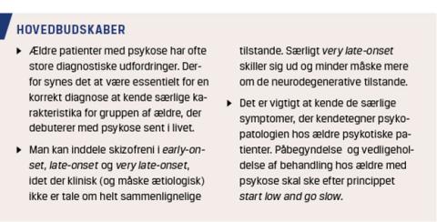 I denne artikel gennemgås sent og meget sent indsættende psykotiske tilstande hos ældre, herunder diagnostik og forslag til påbegyndelse af behandling.