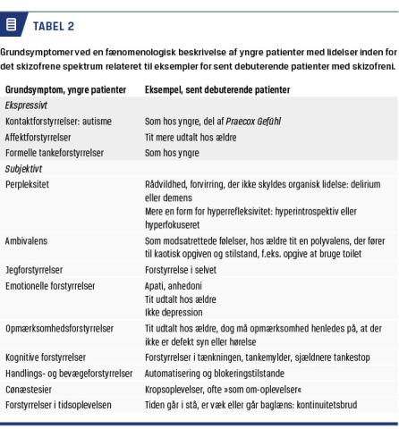 For at få beskrevet patienternes patologi, må man ty til beskrivelsen af de fænomener, som patienterne oplever. En tilgang kan være at beskrive det kliniske billede med symptominddeling som foreslået af Parnas et al [18, 19]. I Tabel 2 ses en beskrivelse af symptomer ved det skizofrene spektrum hos yngre så vel som ældre patienter. Derudover skal man tage stilling til, om patienten er psykotisk i den periode, som vedkommende befinder sig i på undersøgelsestidspunktet [20]. For at beskrive alle disse træk må man bevæge sig noget ud over, hvad diagnoselisten tilbyder. Dette sker ved en grundig undersøgelse og medinddragelse af de pårørende, på helt samme måde som hos yngre patienter [10, 21].