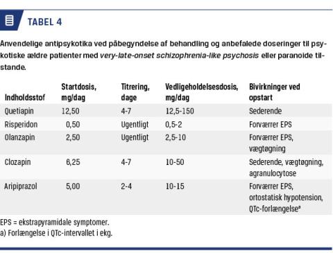 Ved psykotiske tilstande, både skizofreni og paranoide tilstande hos ældre, er evidensbaseret behandling sparsom. Vedrørende medikamentel behandling foreligger der et Cochranereview om behandling af patienter med late-onset-skizofreni uden differentiering [24]. Der findes en undersøgelse, der indgår i en metaanalyse, men data er upublicerede. Andre afventer evaluering, men man har anbefalet atypiske antipsykotika i lav dosering (Tabel 4).