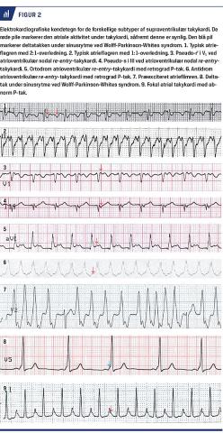accessorisk ledningsbane, som går forbi den elektriske isolering mellem atrier og ventrikler og enten kan lede antegradt, retrogradt eller begge veje [2, 5, 7]. Dette kan resultere i tre typer af takykardi: ortodrom takykardi, antidrom takykardi og præexciteret atrieflimren, hvor atrieflimren ledes over den accessoriske ledningsbane. Ortodrom takykardi er langt hyppigst og udløses typisk af en atrial ekstrasystole på et tidspunkt, hvor den accessoriske ledningsbane er refraktær. Kredsløbet dannes af en impuls, som bevæger sig antegradt igennem AV-knuden og retrogradt igennem den accessoriske ledningsbane [2, 5]. Dette resulterer i en takykardi med smalt QRS-kompleks, og ofte ses en retrograd P-tak adskilt > 90 ms fra forudgående QRS-kompleks [1]. Antidrom AV-re-entry-takykardi kendetegnes ved breddeøget QRS-kompleks og retrograd P-tak [21]. Ved præexciteret atrieflimren ses uregelmæssig ventrikelaktion med vekslende QRS-bredde, men ensartet QRS-akse [22]. Da accessoriske ledningsbaner som regel ikke har AV-knudens dekrementale ledningsevne, dvs. progressivt langsommere ledningshastighed ved forsøg på at sende gentagne impulser igennem vævet, er der risiko for degeneration til ventrikelflimren pga. meget hurtig ventrikelfrekvens. Behandlingen af præexciteret atrieflimren følger derfor ikke de nedenfor beskrevne retningslinjer [1, 7]. Ved antegradt ledende baner ses der typisk en deltatak i starten af QRS-komplekset under sinusrytme som tegn på delvis tidlig ventrikulær depolarisering pga. hurtig elektrisk overledning over den accessoriske bane. Kombinationen af deltatak og SVT-tilfælde kaldes Wolff-Parkinson-Whites syndrom [2, 5]. AV-re-entry-takykardi konstateres hyppigst hos patienter < 20 år og forekommer hyppigere hos mænd end hos kvinder [7, 11, 19, 20].