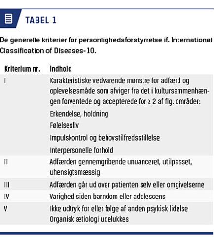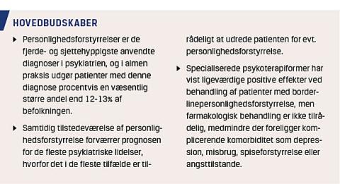 Personlighedsforstyrrelser forekommer hyppigt blandt patienter både i regionernes psykiatri og i almen praksis. Emotionel ustabil personlighedsstruktur er den fjerdehyppigste aktionsdiagnose efter paranoid skizofreni, alkoholmisbrug og tilpasningsreaktion, mens uspecificeret personlighedsforstyrrelse er den sjettehyppigste [1]. Patienter med personlighedsforstyrrelse har øget risiko for selvskade, misbrug, depression, spiseforstyrrelse, somatisk lidelse og tidlig død samt lavere livskvalitet og social funktionsevne end personer uden personlighedsforstyrrelse [2-5]. Der har været uenighed om, hvordan personlighedsforstyrrelser bedst klassificeres, og i de senere år har man bevæget sig væk fra de traditionelle kategorier til fordel for en dimensional vurdering af generel sværhedsgrad og specifikke personlighedstræk. Der er også kommet flere evidensbaserede behandlingsmetoder, der er effektive til behandling af borderlinepersonlighedsforstyrrelse, og der er nu øget viden om lidelsens neurobiologiske og socialkognitive grundlag [6]. De fleste, der beskæftiger sig klinisk og forskningsmæssigt med personlighedsforstyrrelser,