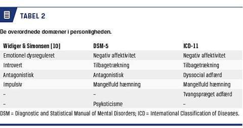 Revisionen af ICD-10 har som erklæret formål at gøre diagnostik af personlighedsforstyrrelser mere simpel, så den kan udføres af alt sundhedspersonale i hele verden [12]. I det foreliggende forslag til ICD-11 bliver alle de eksisterende kategorier forkastet til fordel for vurdering af sværhedsgrad: mild, moderat eller svær og herudover personlighedsvanskeligheder, som tænkes at indgå som Z-diagnose. Der vil være mulighed for at specificere fem trækdomæner: 1) negativ affektivitet, 2) tilbagetrækning, 3) dyssocial adfærd, 4) mangelfuld hæmning og 5) tvangspræget adfærd (Tabel 2), men også med en specifik borderlinepersonlighedsforstyrrelse. Der er relativt stort overlap mellem de fem domæner i ICD-11 og DSM-5, omend psykosenære træk ikke indgår i ICD-11, men derimod i et tvangspræget domæne [13]. Hvad nyskabelser angår, skal det også fremhæves, at der ikke opereres med nedre aldersgrænser for personlighedsforstyrrelser.