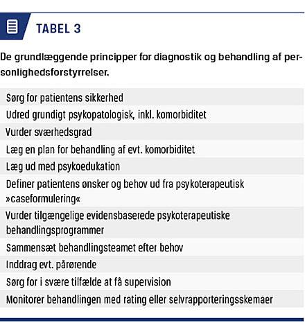 Flere psykoterapiformer ved borderlinepersonlighedsforstyrrelse har vist sig at være ligeværdige, hvad angår effekt, så i dag prøver man at finde de fællestræk, der karakteriserer god behandling på tværs af de eksisterende psykoterapiformer [24]. Mange patienter med personlighedsforstyrrelser får meget ofte medicin pga. følgetilstande som misbrug, depression, bulimi og angsttilstande, men selve personlighedsforstyrrelsen påvirkes dog ikke ad medicinsk vej, og i Sundhedsstyrelsens retningslinjer for behandling af emotionel ustabil personlighedsforstyrrelse anbefales det også, at man pga. risiko for polyfarmaci er tilbageholdende med at anvende psykofarmaka [25]. Enkle grundlæggende behandlingsprincipper for psykiatere og læger med basale evner i samtaleterapi ved behandling af personlighedsforstyrrelser fremgår af Tabel 3 [26].