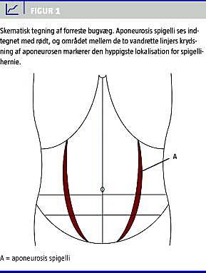 Spigellihernie er forbundet med en høj strangulationsrisiko på 12-24% [1-3]. Herniet er sjældent forekommende og opstår på grund af en defekt i bugvæggen svarende til aponeurosis spigelli lateralt for rektusmuskulaturen (Figur 1 ) [4-6].