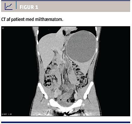 Miltlæsion skal haves in mente ved alle tilfælde af stumpe traumer mod abdomen, særligt i venstre side. Klinisk undersøgelse af abdomen er af lav diagnostisk værdi i forhold til at udelukke intraabdominal skade, hvorimod positive fund i form af peritoneal reaktion eller distenderet abdomen giver kraftig mistanke om en behandlingskrævende lidelse. Af denne årsag er billeddiagnostik en nødvendighed ved mistanke om miltlæsion. Focused assessment with sonography for trauma (FAST) er en hurtig ultralydundersøgelse, hvormed man med en sensitivitet og en specificitet på knap 100% (hos voksne) kan påvise fri væske intraperitonealt som tegn på blødning fra milten eller andre organer [5]. Uanset fundene ved FAST foretages der CT med i.v. kontrast givet i tidlig arteriel og venøs fase hos en stabil patient, hvor man har mistanke om miltlæsion,. Herved visualiseres milten og eventuelle læsioner, herunder milthæmatomer (Figur 1). Graden af miltskaden kan herefter fastslås ved brug af American Association for the Surgery of Trauma (AAST) Injury Score [6] (Tabel 1). Ved stumpe abdominale traumer har CT en sensitivitet på over 90% og en specificitet på næsten 100% – og højere værdier ved milt- og leverskade end ved tarmlæsion [7].