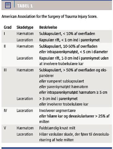 da over 95% af dem, der rebløder, vil gøre det i dette interval [17, 27], men så vidt vides findes der ikke randomiserede studier, hvis resultater understøtter denne tilgang. Flere studier har vist, at stigende grader af miltlæsion øger risikoen for konvertering til operativ behandling [28], og derfor anbefales en længere observation af patienter med grad 3-4-læsioner fortsat.