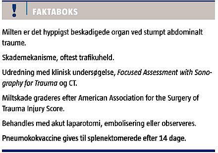 Milten er det organ, der hyppigst (40-55%) beskadiges efter et stumpt abdominalt traume [1]. Miltskade kan opstå på flere forskellige måder, oftest ved involvering i trafikuheld, mens mindre dramatiske traumer, som er opstået ved simple fald og sportsaktiviteter også kan føre til miltskade [2]. Her beskrives spektret af kliniske præsentationer samt behandlingen af patienter med stumpe milttraumer.