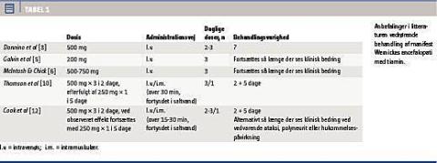 Den mest udbredte anbefaling af doseringsinterval er tre gange dagligt [3, 5, 6, 10, 12] pga. tiamins forholdsvis korte halveringstid på ca. 96 min [3, 5, 13]. Men med hensyn til dosis og behandlingsvarighed er det vanskeligere at finde entydige retningslinjer. Ved manifeste symptomer på WE anbefales døgndoser på 500-2.250 mg givet i.v. fordelt på 2-3 daglige doseringer [3, 5, 6, 10, 12]. Nogle steder anbefales det at behandle så længe, at der ses en bedring af symptomerne [5, 6, 12], hvorimod man andre steder anbefaler behandling i et bestemt antal dage Tabel 1 [10, 12]. De regionale fællesinstrukser for psykiatrien i Danmark giver ikke ensartede retningslinjer, men i alle regioner anbefales det at begynde med i.v.-behandling med døgndoser p å 800-1.600 mg. Behandlingslængden varierer mellem en og fem dage, og efterbehandlingen per os varierer mellem ti og 21 dage [14-16].