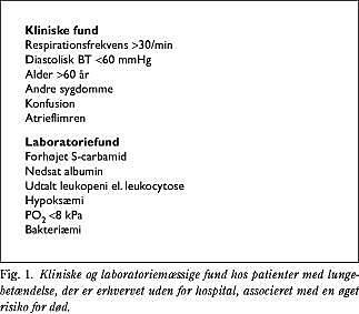 Pneumoni, der er diagnosticeret i almen praksis, tilhører af praktiske årsager altid gruppen pneumoni erhvervet uden for sygehuset (community acquired ). Hyppigste bakteriologiske agens er Streptococcus pneumoniae , sjældnere er non-kapsulate Haemophilus influenzae , Mycoplasma pneumoniae , Chlamydia pneumoniae , Legionella pneumophilae og Moraxella catarrhalis . I en dansk undersøgelse (19) fandtes følgende hyppigheder blandt 254 indlagte patienter over en 5-års-periode: Streptococcus pneumoniae 37%, Haemophilus influenzae 18%, Mycoplasma pneumoniae 11%, Legionella pneumophilae 9% og Chlamydia pneumoniae 3%. En svensk undersøgelse (20) fandt tilnærmelsesvis samme hyppigheder. I denne undersøgelse og i en dansk (21) fandtes hyppigheden af Moraxella catarrhalis at være henholdsvis 2% og 3,5%. Patogeniciteten af Moraxella catarrhalis er omdiskuteret, og 84% er beta-laktamase-producerende (22). Engelske undersøgelser finder, at incidensen af pneumoni er ca. 30 tilfælde per 1.000, hyppigst i aldersgrupperne < 5 og > 65 år (2). Det kliniske billede ved pneumoni er præget af feber med hoste og ekspektoration evt. purulent, dyspnø og stingsmerter. Uspecifikke symptomer som hovedpine, myalgier, artralgier og specielt hos ældre snigende og symptomfattig debut findes også, således at det kliniske billede kan være meget broget. Undersøgelser har vist, at det kliniske billede ikke er tilstrækkelig pålideligt til at kunne sige noget om mulig ætiologi (23). Med hensyn til at prædiktere forløbet af pneumonien, og hvilke patienter der umiddelbart bør henvises til indlæggelse på hospital, er der udarbejdet flere algoritmer, der også er afprøvet i almen praksis (2, 24-28). Fælles for dem er, at de er modificeret ud fra The British Thoracic Society Guidelines for behandling af pneumonier, der er erhvervet uden for hospital (24). Fig. 1 viser udvalgte markører, der er associeret til en dårlig prognose. I en norsk undersøgelse fra almen praksis indgik i alt 402 patienter, hos hvem man havde mistanke om nedre luftvejsinfektioner (29). Som referencestandard for diagnosen pneumoni anvendtes den radiologiske diagnose pneumoni (n = 20). Konklusionen på undersøgelsen er, at ved akut sygdom med lungesymptomer under fem dages varighed er den bedste test for pneumoni temperatur > 38°C aften, C-reaktivt protein (CRP) > 50 mg/l og leucocyttal > 10 x 109 /l. CRP er tilgængelig i en nær-patient-test, som kan aflæses i løbet af få minutter, mens patienten er i klinikken. Såfremt CRP er under 50 mg/l kan bakteriel infektion udelukkes med 95% sikkerhed, og som følge heraf vil bakteriel infektion stort set kunne udelukkes ved endnu lavere CRP-værdier, blot skal man være opmærksom på, at patienter med en meget hurtig symptomudvikling (under 24 timer) kan have en bakteriel infektion, uden at CRP kan nå at stige til værdier over 50 mg/l. Samme undersøgelse viste også, at læger tillagde krepitation alt for stor værdi. I andre undersøgelser (26) har diagnosen pneumoni været vanskeligere ved samtidig forekomst af asthma. Dette er væsentligt og stemmer i øvrigt godt med den kliniske lungemedicinske erfaring, at en meget stor andel af ikkerygere, der henvises til sekundærsektoren på grund af recidiverende pneumoni, viser sig at have asthma.