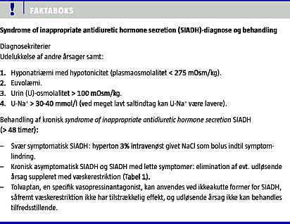 Der eksisterer fire registrerede vasopressin V2-receptor-antagonister, men kun tolvaptan er registreret i Danmark til brug på indikationen SIADH. De to største randomiserede kliniske studier er SALT-1 og SALT-2 [17], hvor man inkluderede patienter med såvel hyper- som euvolæmisk hyponatriæmi. En analyse af gruppen med SIADH (n = 110) [18] viste signifikant effekt af tolvaptan på hyponatriæmi og fysisk velbefindende med samme hyppighed af bivirkninger i begge grupper og uden forekomst af CPM. I studiet var der ikke inkluderet nogen tilfælde med P-Na + < 120 mmol/l, og diagnosen SIADH var udelukkende baseret på U-Na + -målinger hos 49 ud af 110 patienter. Hos tre patienter (5,9%) blev korrektionshastigheden for de første 24 timer overskredet, men den maksimale stigning i P-Na + -koncentrationen var blot 13-14 mmol/l. Studierne var ikke designet til vurdering af SIADH som selvstændig gruppe, og diagnosen var ikke stringent, hvorfor der bør udvises forsigtighed med anvendelse af tolvaptan ved svær SIADH med P-Na + -koncentration på under 120 mmol/l. Hvis tolvaptan bruges ved svær SIADH, bør en startdosis på 7,5 mg dagligt overvejes [18]. Ved hyponatriæmi med P-Na + < 120 mmol/l uden effekt af væskerestriktion, eller hvor symptomerne kræver akut intervention, tilrådes brug af hyperton NaCl, der for nærværende formodes at have en sikrere og hurtigere effekt.