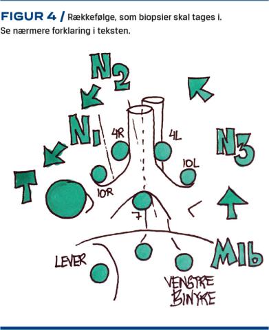 Nu trækkes EBUS-endoskopet ud af trachea og drejes skråt mod venstre og bagud, så det glider ned i øsofagus, altså EUS-B. De seks landmarks [11] opsøges af samme grund som nævnt ovenfor i denne rækkefølge: leveren → aorta abdominalis → venstre binyre → station 7 → station 4L → station 4R. Biopsier tages i rækkefølgen M1b → N3 → N2 → N1 → lungetumor, i Figur 4 ses en skematisk oversigt over biopsirækkefølgen. Kombinationen af de to procedurer EBUS og EUS-B tager omkring 20 minutter, men kan vare længere tid afhængigt af den kliniske situation, indikationen og antallet af læsioner, som biopteres.