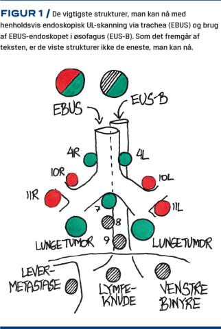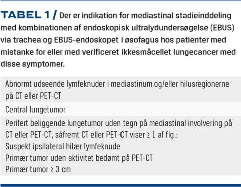 Lungekræft er en af de hyppigste kræftformer i Danmark, og hvert år rammes over 4.000 mennesker. Patienter med småcellet lungecancer (SCLC) (ca. 20%) behandles med stråle- og kemoterapi. Hos patienter med ikkesmåcellet lungecancer (NSCLC) stiler man i første omgang mod operation eller stereotaktisk stråleterapi, medmindre sygdommen har bredt sig. For at afgøre om dette er tilfældet, er en sikker TNM-klassifikation og stadieinddeling vigtig, hvor særligt bedømmelse af spredning til lymfeknuder i mediastinum er helt essentiel. Positronemissionstomografi (PET) med CT anvendes ofte i stadieinddelingen. Imidlertid kan PET-CT give både falsk positive og falsk negative resultater, f.eks. falsk positiv ved reaktive lymfeknuder og falsk negativ ved lymfeknuder under 10 mm eller tumorer uden øget metabolisk aktivitet for det anvendte sporstof. Patienter med NSCLC og upåfaldende lymfeknuder i mediastinum bedømt på PET-CT har 3-30% risiko for at have spredning af lungecanceren til mediastinum, afhængig af tumorstørrelse, -type, -beliggenhed og -udbredelse [1]. Det er derfor ofte nødvendigt at bioptere strukturer både med og uden øget metabolisk aktivitet for at afgøre, om de er maligne eller ikkemaligne.