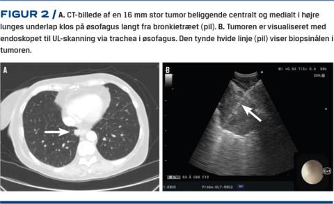 Med EUS-B-FNA kan man ud over at visualisere og bioptere lymfeknuder i mediastinum nå venstre binyre [2, 3], metastaser i venstre leverlap [4, 5], retroperitoneale lymfeknuder [5], lungetumorer [6] samt pleurale tumorer [7], og det er muligt at aspirere ascites- [8] og perikardievæske [9]. I Figur 1 ses en skematisk oversigt over strukturer, der kan biopteres ved hhv. EBUS-TBNA og EUS-B-FNA. I en randomiseret undersøgelse fandt man samme diagnostiske sensitivitet, når venstre binyre blev biopteret med enten det tyndere EBUS-endoskop eller det tykkere gastroenterologiske EUS-endoskop [3], men der mangler fortsat tilsvarende data for de øvrige nævnte strukturer. Ud over bioptisk at kunne verificere en eventuel spredning af en lungecancer og derved afværge en forgæves kurativt intenderet behandling er det en særlig styrke ved EUS-B, at man kan bioptere lungetumorer, der ikke kan nås fra luftvejene, men som ligger tæt på øsofagus [6]. På denne måde kan man undgå at udsætte patienten for en CT-vejledt perkutan lungebiopsi, der indebærer en langt større risiko for pneumothorax (Figur 2).