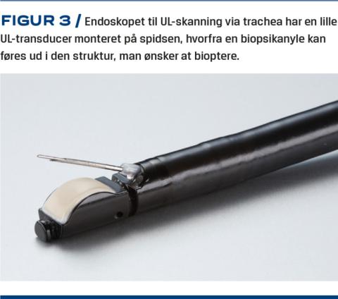EBUS-endoskopet ligner det almindelige bronkoskop, men har en lille UL-transducer monteret på spidsen, hvorfra en biopsinål kan føres ud i den struktur, man ønsker at bioptere (Figur 3).
