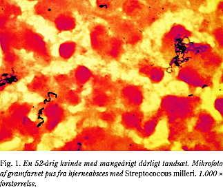 Streptokokker (S.) (aerobe, anaerobe og mikrofile) er de bakterier, som oftest dyrkes fra abscesmaterialet (op til 70%), og de er ofte isoleret sammen med andre mikroorganismer (30-60%). Disse streptokokker er specielt S. milleri-gruppen (S. anginosus, S. intermedius) (Fig. 1 ), der findes normalt i mundhulen og i de kvindelige genitalier og har en evne til abscesdannelse. Staphylococcus aureus (Fig. 2 ) udgør 10-15% af isolaterne, specielt fra patienter med kranie-traumer eller infektiøs endocarditis og isoleres oftest som eneste mikrobe. Det er vigtigt også at dyrke anaerobt fra hjerneabscessen (ofte mere end 50% positive), hvor Bacteroides- og Prevotella- arter kan ses. Tarmens gramnegative bakterier, såsom E. coli, Klebsiella, Pseudomonas og Proteus- arter, isoleres i ca. en tredjedel af tilfældene, ofte hos patienter med et ørefocus eller hos immunkompromitterede patienter. Også mange andre patogene mikroorganismer kan findes i hjerneabscessen hos specielt immunkompromitterede patienter (hiv-smittede, organtransplanterede, steroidbehandlede og patienter med en malign lidelse) som fx patienter, der er inficeret med Nocardia og Actinomyces, svampe som Candida og Aspergillus og protozoer som Toxoplasma gondii (ses specielt hos hiv-smittede), Trypanosoma cruzi, Entamoeba histolytica og orme og ikter som Schistosoma spp., Paragonimus og Taenia solidum. Forekomsten af dyrkningsnegative hjerneabscesser varierer, men kan ses i op til en tredjedel af tilfældene.