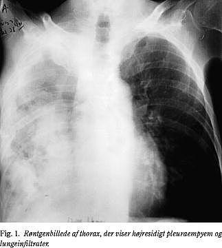 Den torakale actinomykose (ca. 15%) med pulmonal infektion som følge af aspiration viser sig som en langsomt progredierende proces, som både kan inddrage lungeparenkymet og pleura (Fig. 1). Patienterne har symptomer i form af brystsmerter, feber, vægttab og hoste. Ofte ses ingen specifikke radiologiske forandringer, og alle lungelapper kan være afficeret.